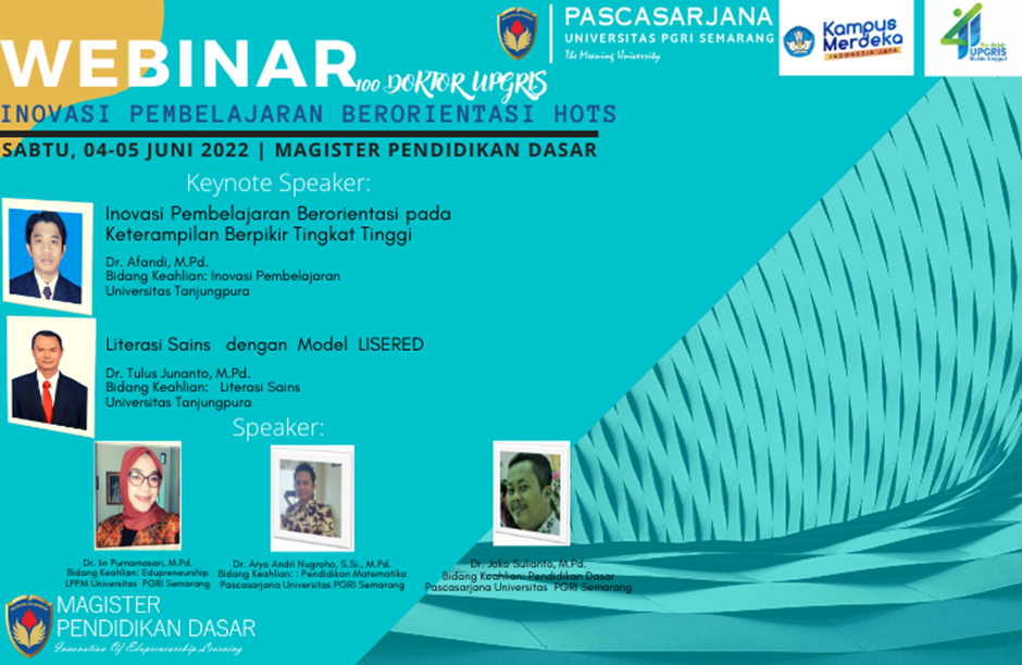 Semarang, 4 Juni 2022 – Program Studi Magister Pendidikan Dasar Universitas PGRI Semarang telah melaksanakan WEBINAR dengan tema Inovasi Pembelajaran Berorientasi Hots. Webinar ini bertujuan untuk meningkatkan wawasan inovasi pembelajaran pendidikan dasar.